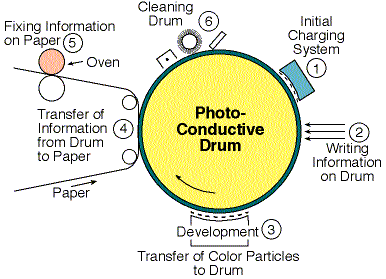 - Transfer – The resulting toner image on the surface of the drum is transferred from the drum onto a piece of paper that has an even greater negative charge than the drum has.