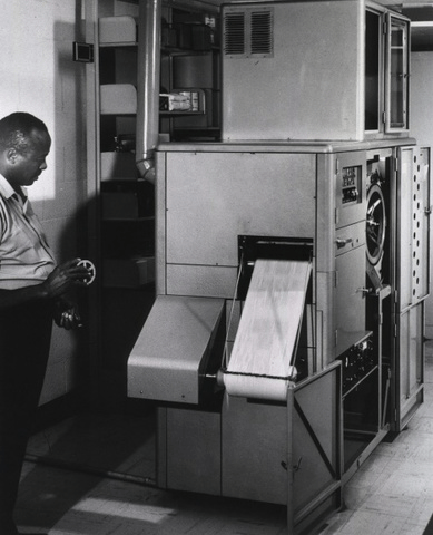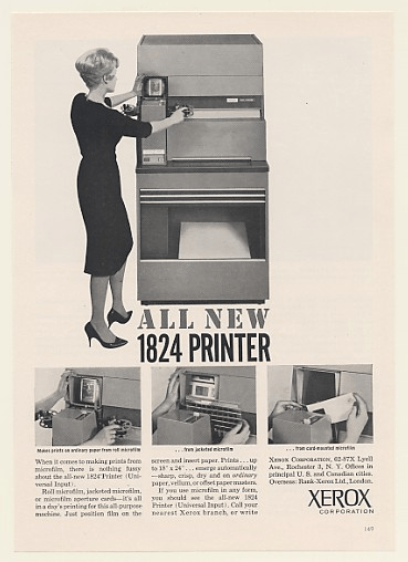 The Copyflo was a large microfilm printer that could produce positive prints on roll paper from any type of microfilm negative. The process was then scaled down to produce the 1824 Microfilm Printer.